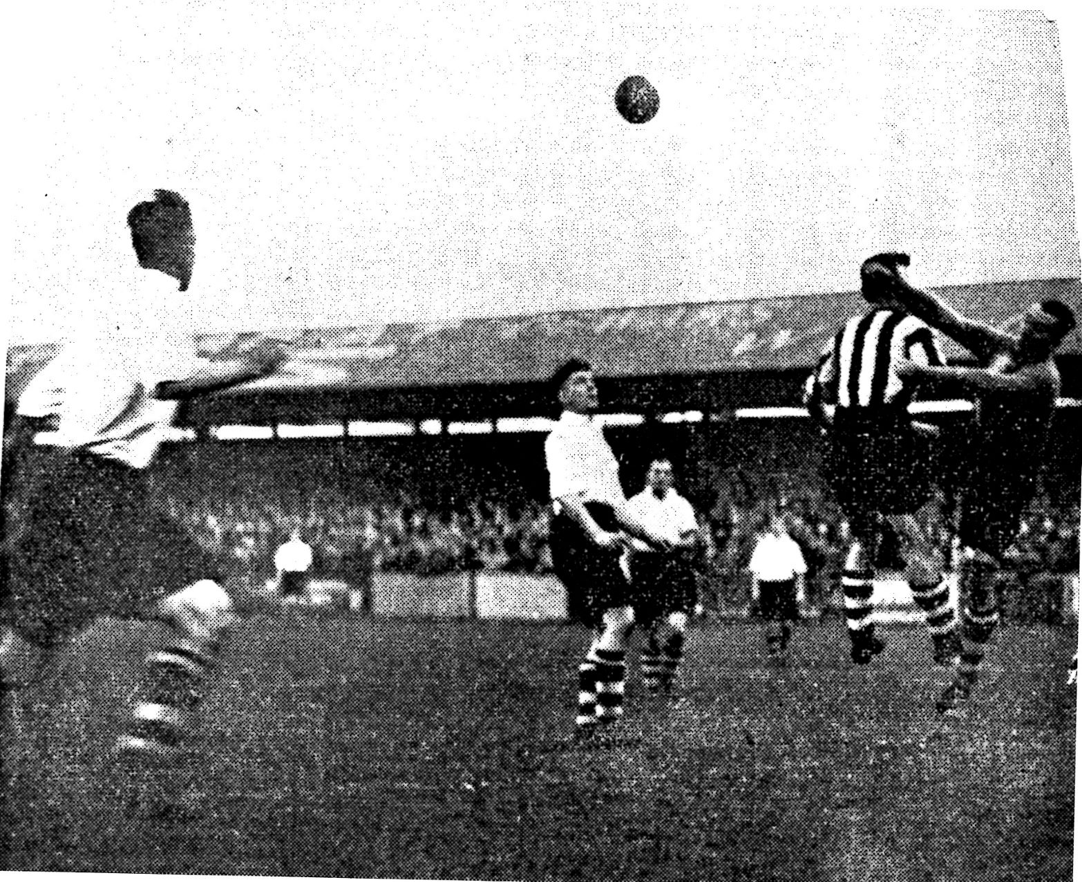 An exciting moment in the Southport v Stockport County match at Haig Avenue. Patrick robbed by McDonough, the Stockport ‘keeper, when about to bring off a snap header.