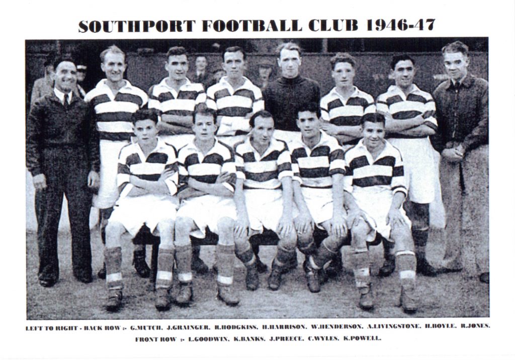 So there was great excitement and huge attendances when the season oepened. There was also a sense of deja vu, as the League retained the fixture list which had been abandoned so abruptly in 1939-40. Southport thus started at Darlington again and followed up with the home matches against Tranmere Rovers and Hull City. The immediate difference for the returning Sandgrounders was the new strip; gone were the familiar black and white stripes and in their place since 1944 had been green and white hooped shirts with white shorts, donated in 1939 by club director Bill Paulden. They were not the luckiest of outfits for Southport, however and after the 1947-48 campaign they were to be discarded in favour of the old colours.