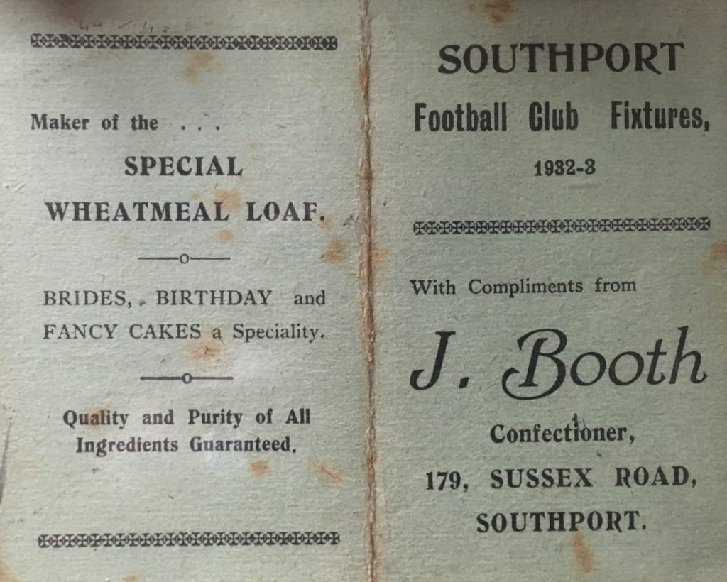 An attractive and very neatly filled-in fixture card for season 32/33. Issued with compliments by J Booth, Confectioners of Sussex Road. Ironically, I remember the shop from visiting my grandparents for holidays as a child, and would accompany them to purchase bread and cakes. They lived at 194 Sussex Road, and were avid supporters (my grandfather had attended Southport’s first game at Ash Lane with his father as a three year old, and went to all home matches and many away into the late seventies, when he succumbed to ill health). It used to have a green frontage, which I guess ties in with the green (now faded) fixture card. Sadly, along with many corner shops, it disappeared c.1990 and is now a house.