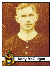 McGuigan was with Hibernian before going to Liverpool for the 1900-01 season. He was a forward who was at Anfield for just two seasons in the early 1900’s. He made his debut on 6th October 1900 when the Reds visited Derby County and scored 5 times in the 13 first division games he was selected for that year, enough to be eligible for a League championship medal, the club’s first Division One title. Liverpool slumped to 11th place a year later as they unsuccessfully defended their crown but Andy still contributed a goal every other game to give him respectable final figures for Liverpool of 14 from 32 league matches. He also played in four FA cup ties for the club.