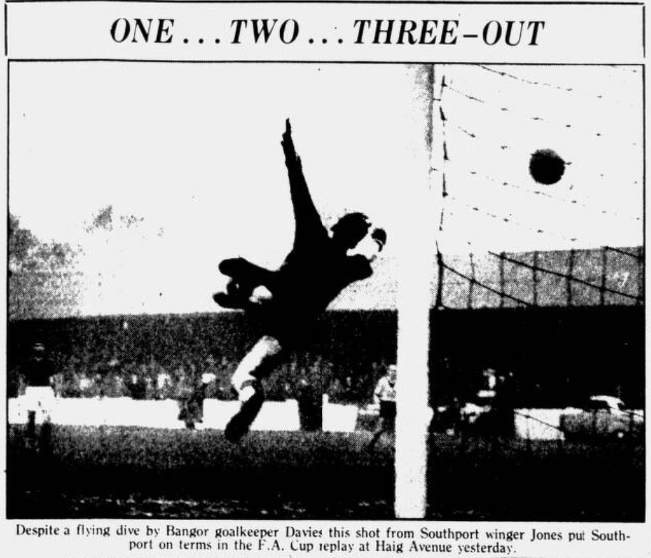 Bangor went ahead with a shock goal after 13 minutes. Wilkinson sent left winger David Jones away and ex-Southport inside right GRYBA was on hand to head home his centre.