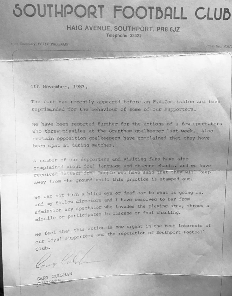 In 1983, the Southport Chairman, Gary Culshaw, issued the above letter to supporters. Does anyone remember the incidents that led to Southport FC being reprimanded? With an average home gate of only 311 for season 83/84, we would think that the perpetrators were swiftly identified and dealt with!